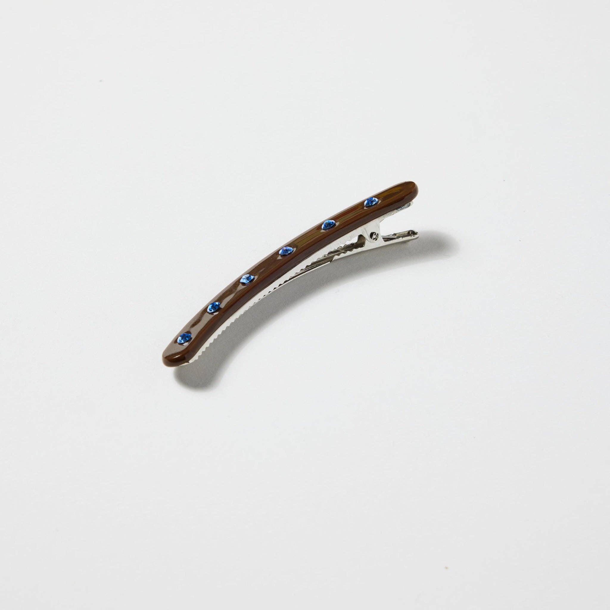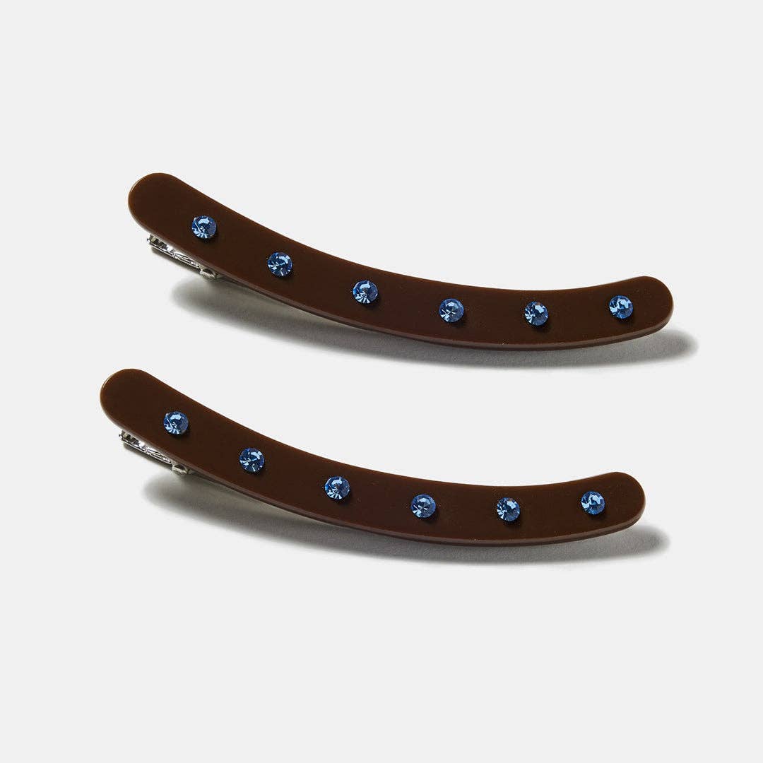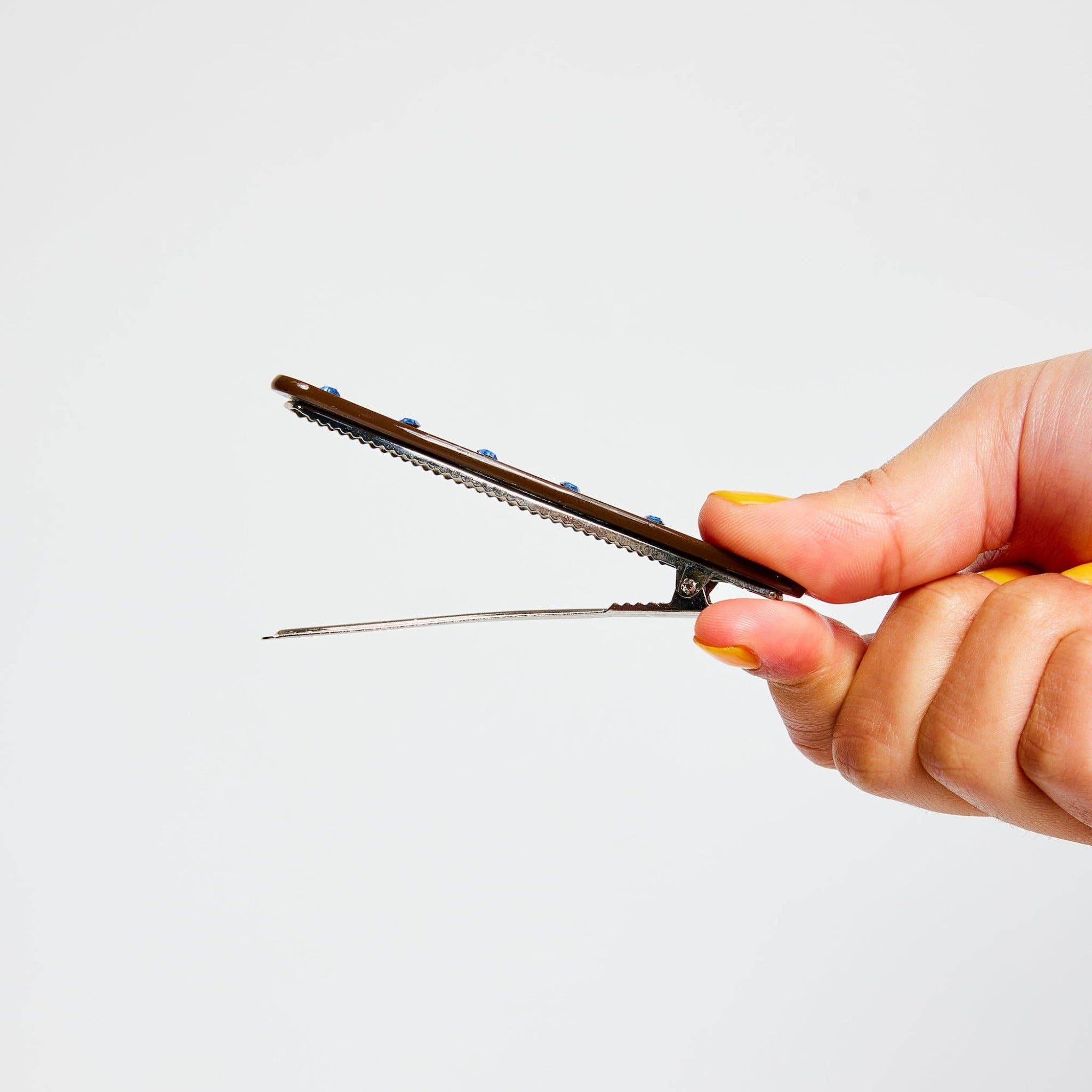 A pack of 2 large alligator style clips, accented with rhinestones. Small metal teeth provide a strong hold with no snag. Ideal for all hair types and lengths. Great for keeping your hair neatly tucked away. Made from high quality acetate; a durable, plant based bio-plastic. Metal hardware is lead and nickel-free. Slight variations will appear with pattern, color and form due to the handmade nature of the product. Measures approx 3.3"L x 0.39"H x 0.59"D Color: brown, light blue rhinestones, silver tone hardware