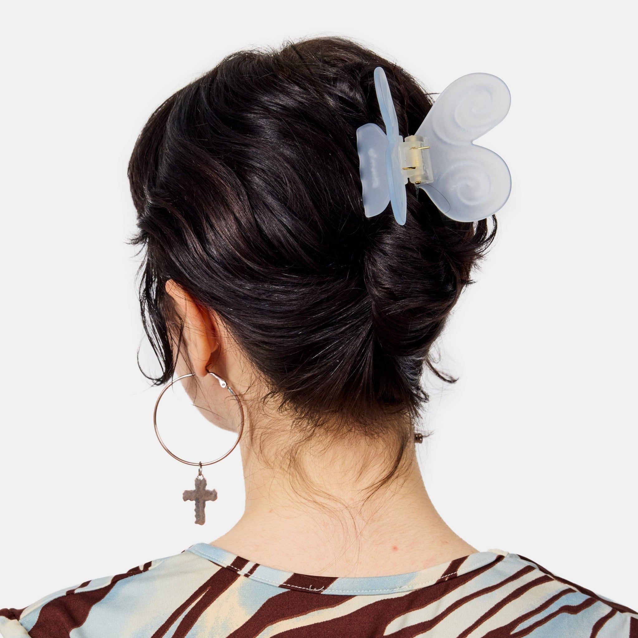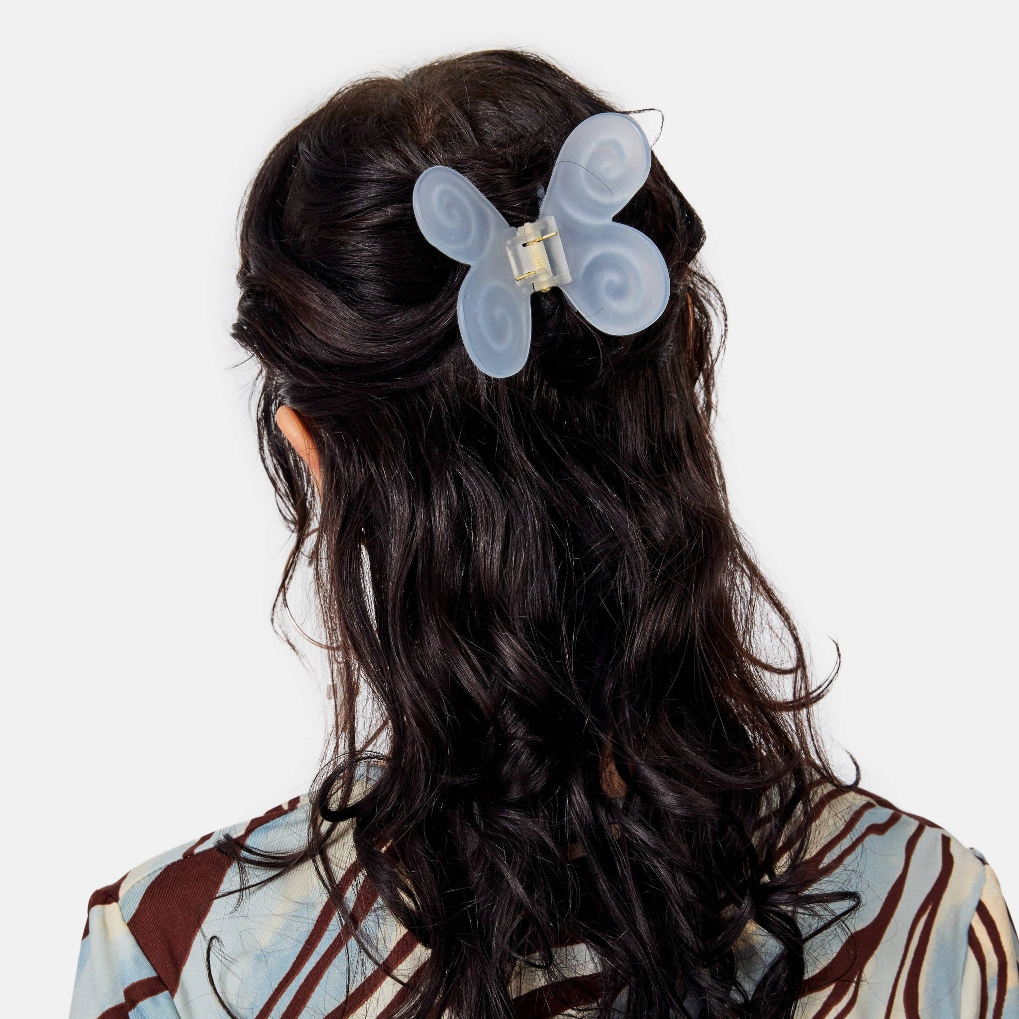 This medium sized hair claw features dreamy swirl butterfly wings and a soft matte finish. Provides a secure hold for thin to medium hair, perfect for quick French twists or effortless half-up styles for thicker hair. Made from high quality acetate; a durable, plant based bio-plastic. Metal hardware is lead and nickel-free. Slight variations will appear with pattern, color and form due to the handmade nature of the product. Claw measures approx 1.5"L x 1"H x 1.75"D Butterfly wings measures approx 2.75"Lx 1.6"H Color: clear, silver tone hardware