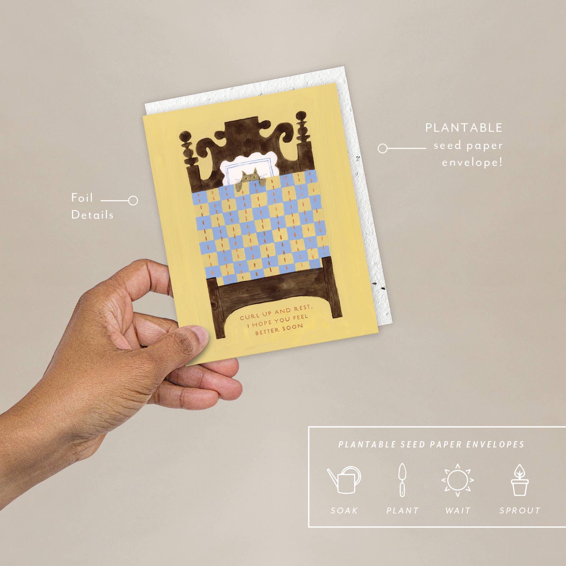 All Seedlings greeting cards have foil details and a PLANTABLE seed paper envelope which is embedded with wildflower seeds. This seed paper is made of a biodegradable eco-paper created with post-consumer materials - no trees harmed for this paper! When planted, our envelopes compost away leaving only flowers behind. Blank inside, our cards are printed on premium paper and are all accented with foil details. All Seedlings cards are made in the U.S.A. Card size: 4.25" x 5.5" Env: 4.3125" x 5.75" (A2)