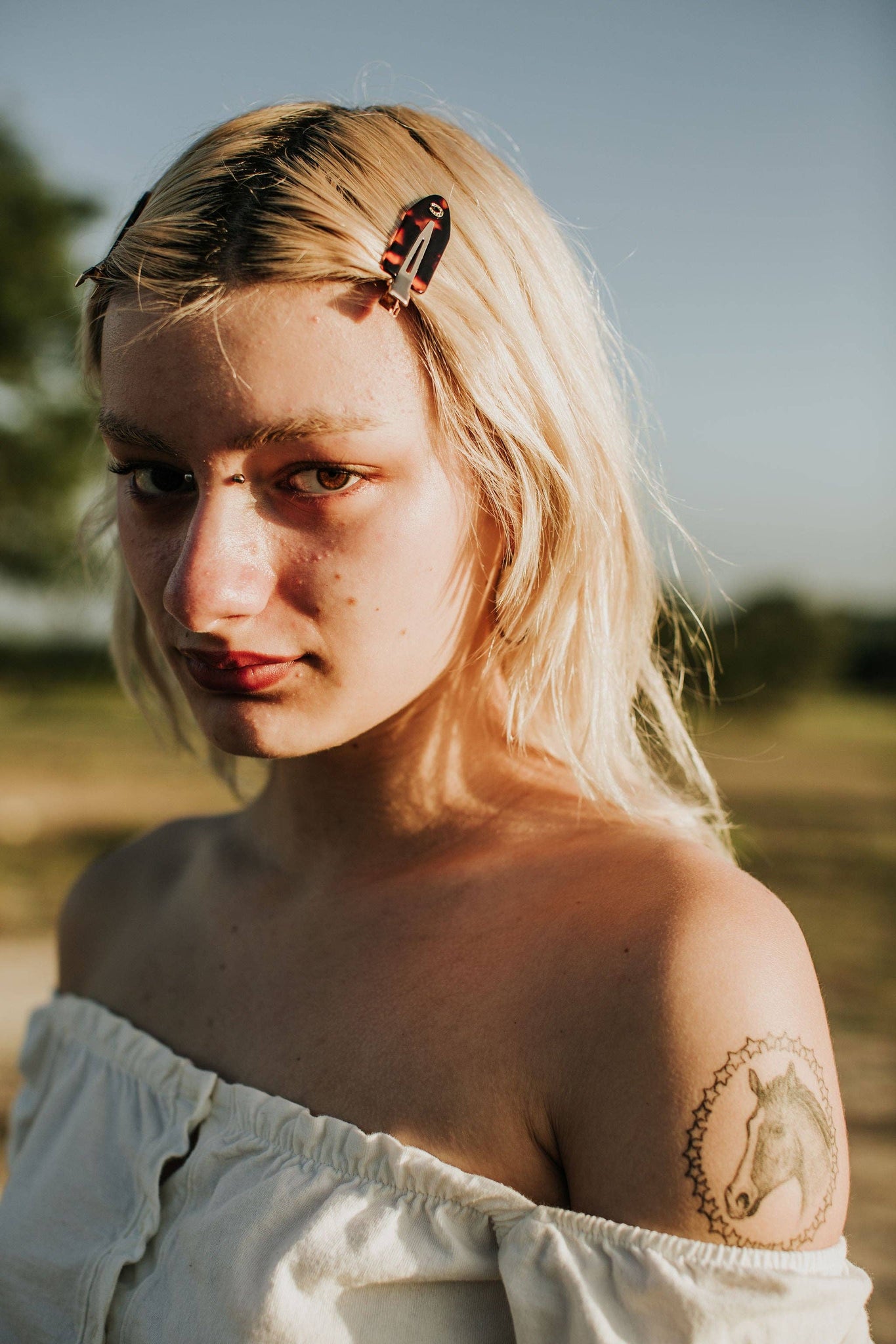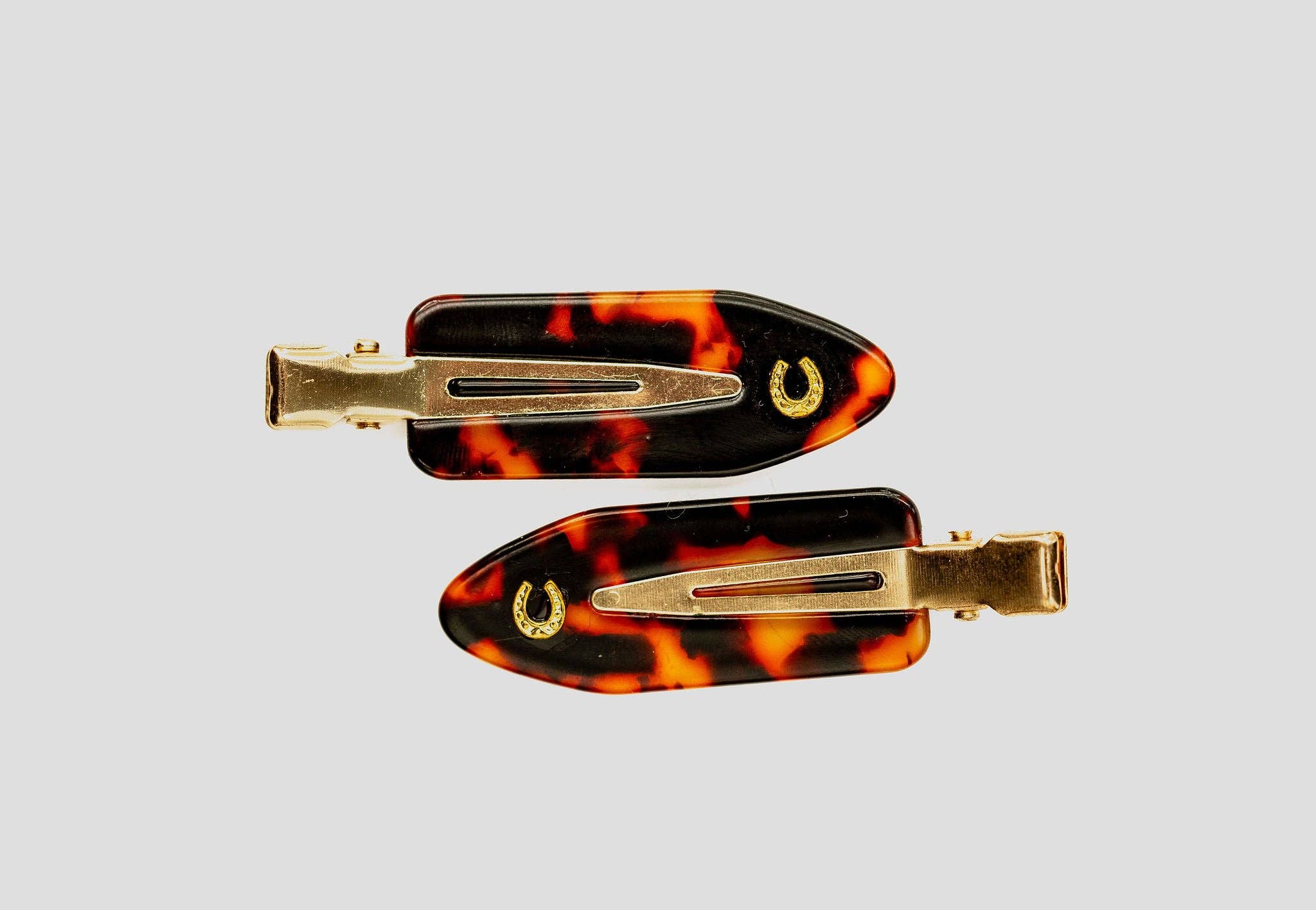 Country girls need to get ready too. The Good Luck, Babe Setting Clips are ideal for makeup application, skincare, and styling in all types of hair. The Good Luck, Babe Setting Clips come in a classic tortoise acetate with gold horseshoe charm details. * 2.5 inches long. Designed in Austin, Texas and responsibly made in China, the Good Luck, Babe Setting Clips are hand assembled from plant-based cellulose acetate. Due to the nature of the materials and process, each piece is unique and small variations will occur.