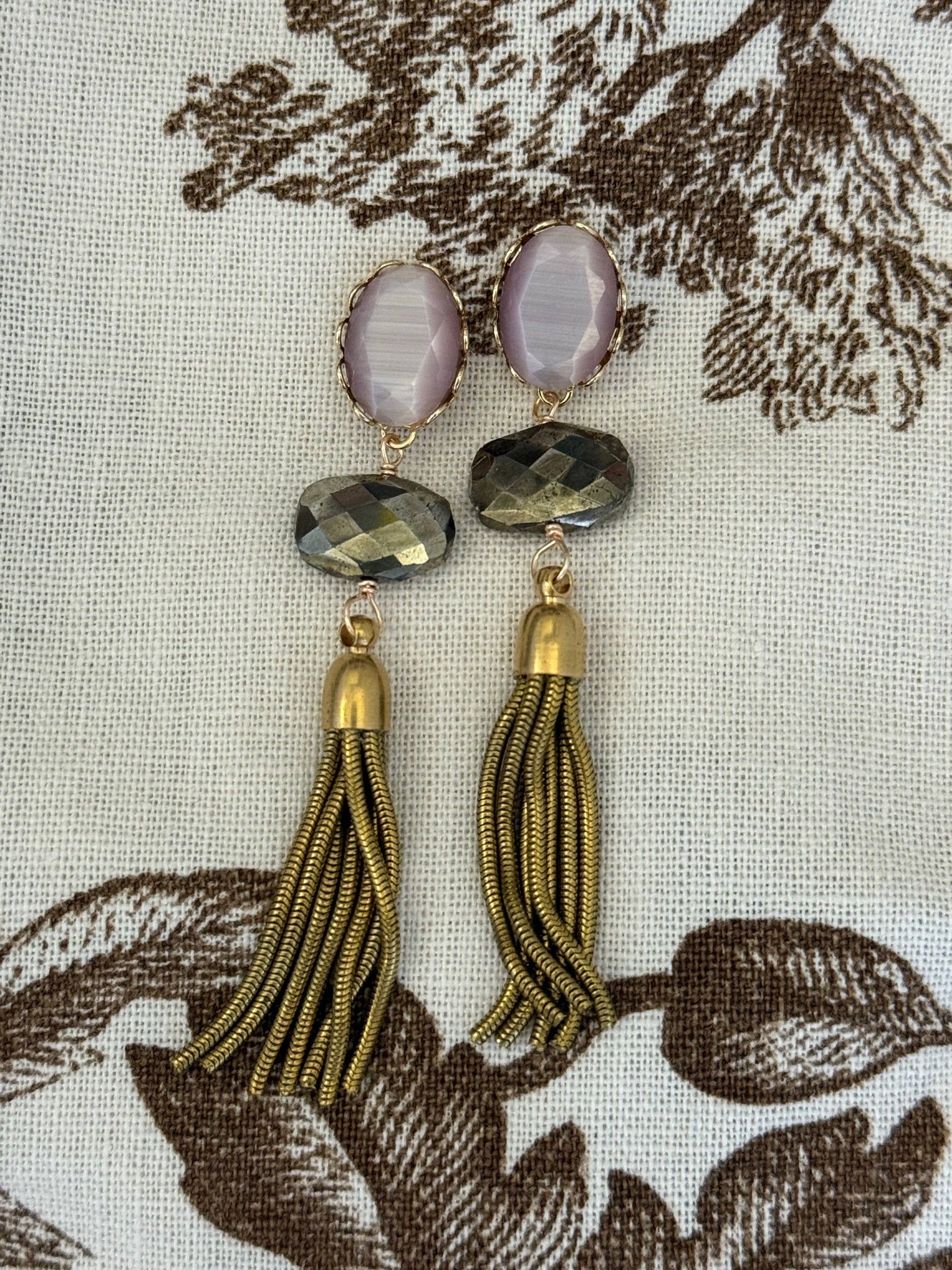 Tassels that flow effortlessly always catch my eye! * Faceted Pyrite and Cat-eye cabochon * Brass tassel * 2"L * Handmade in NYC