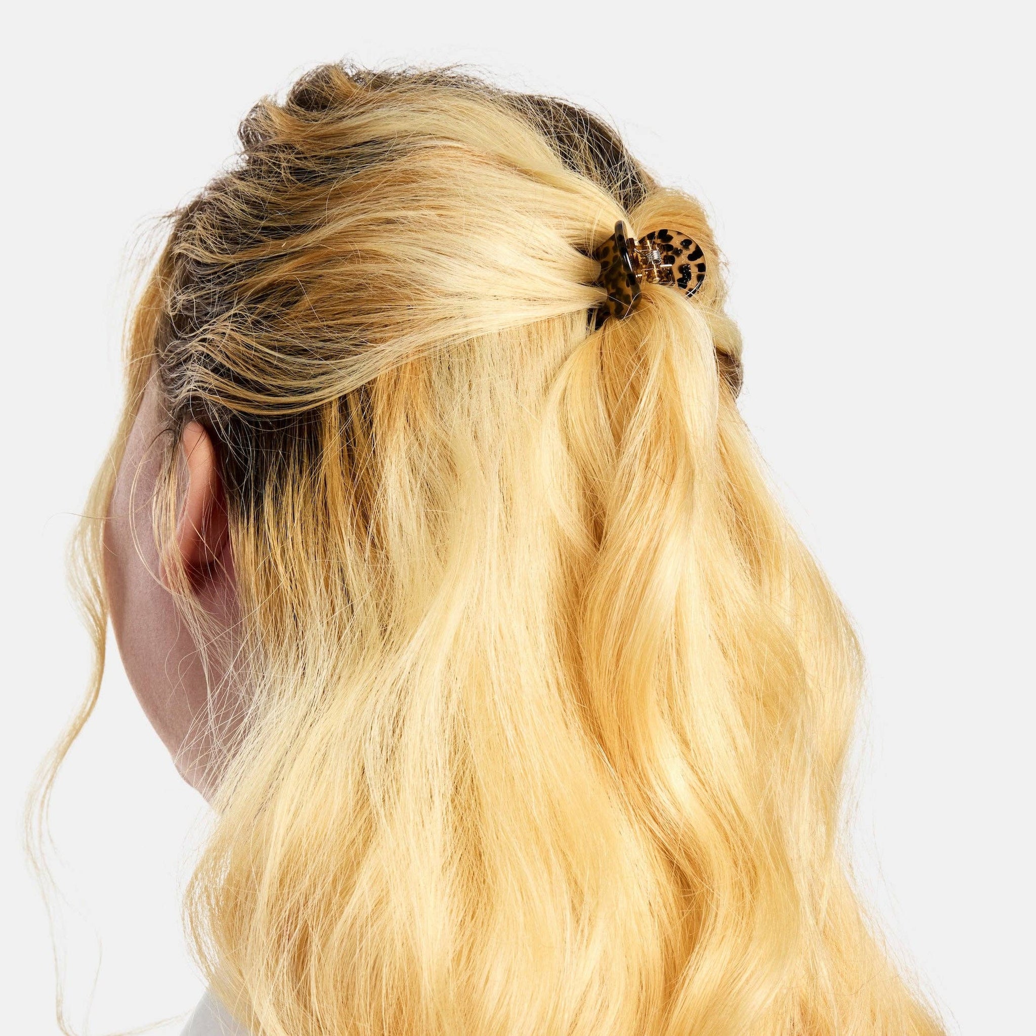 These small claws are perfect for all hair types and textures. Versatile and playful, use one to hold your hair back or multiple to create a look. Made from high quality acetate; a durable, plant based bio-plastic. Metal hardware is lead and nickel-free. Slight variations will appear with pattern, color and form due to the handmade nature of the product. Measures approx 1"L x 1.25"H x 1.25"D Color: brown, silver tone hardware