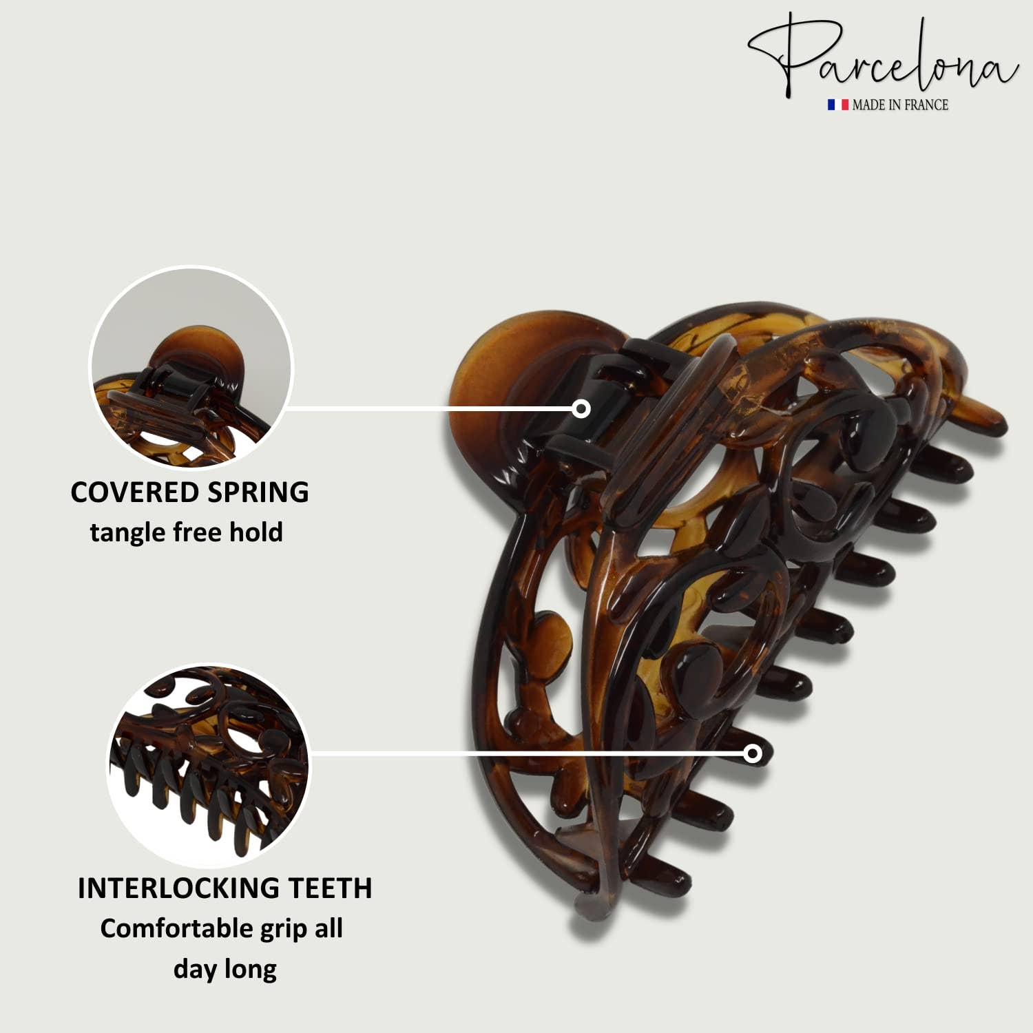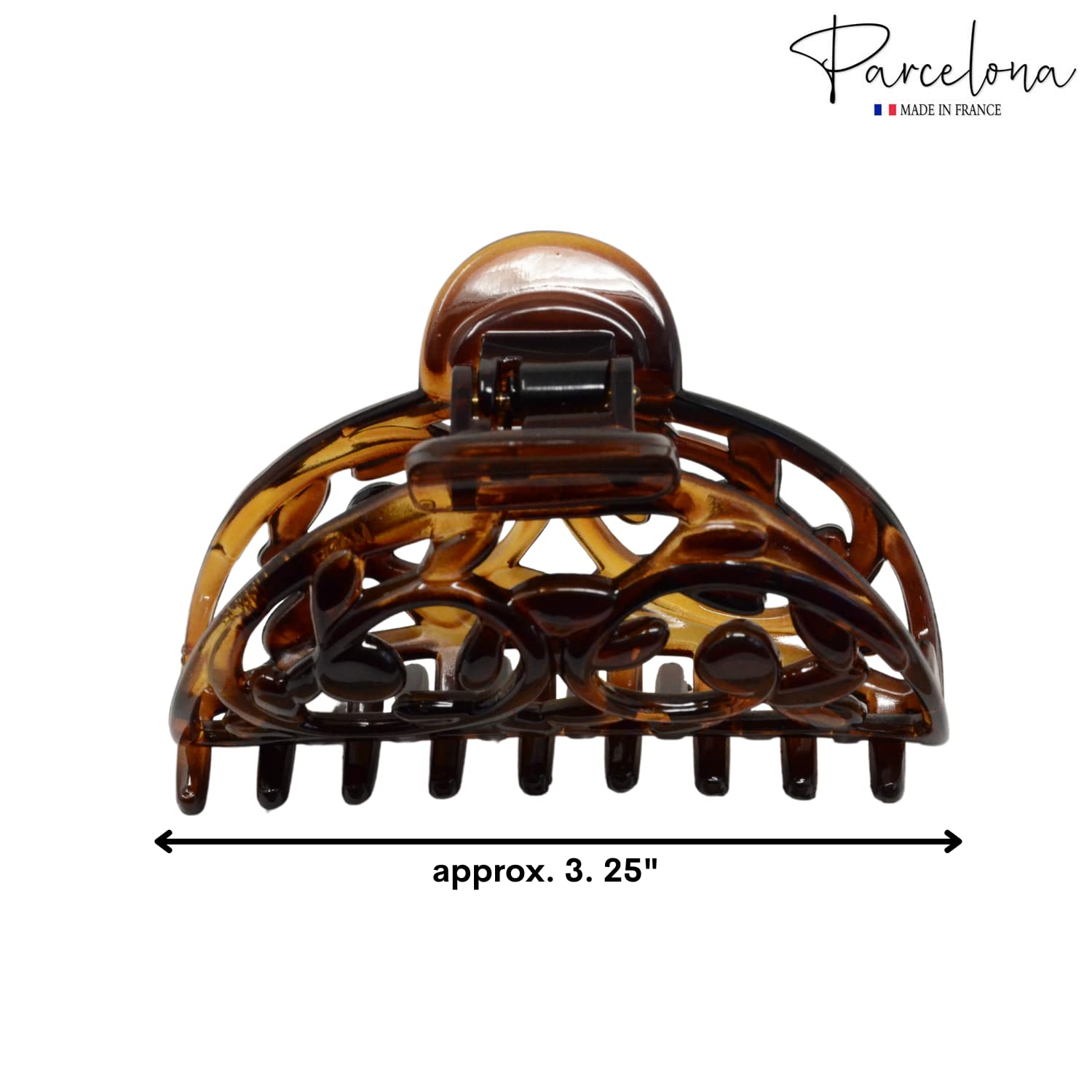 ABOUT THE PRODUCT Made in France; Hair accessories by Parcelona. Interlocking teeth will hold your hair securely and comfortably; no sharp teeth to snag your hair. Suitable for long fine, medium to thick hair types. Covered spring; won't slip out of hair; strong soft material. SPECIFICATION: Size : Approx. 3.25" (8 cm)