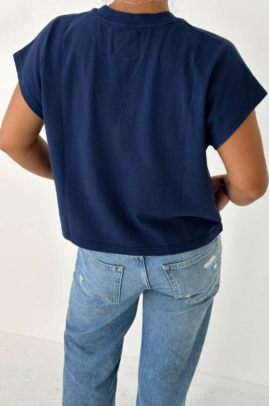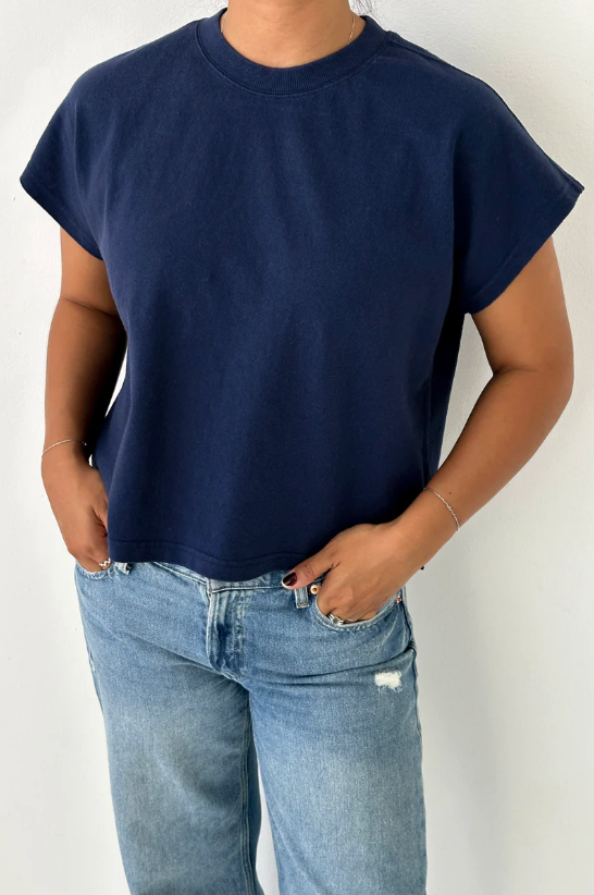 Jeanne Tee is our perfect muscle tee. She features a shorter length to pair perfectly with high waisted bottoms but still give enough coverage for mid-rise bottoms and just the right amount of off shoulder dolman sleeve. She has a high crew neck with an extra wide neckband that adds to her signature charm.